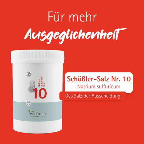 Das Schüßler-Salz Nr. 10 Natrium sulfuricum von Pflüger, das Salz der Ausscheidung, kann den Körper bei inneren Reinigungsprozessen unterstützen. In der Sommer- und Reisezeit ist Schüßler-Salz Nr. 10 ein zuverlässiger Begleiter.