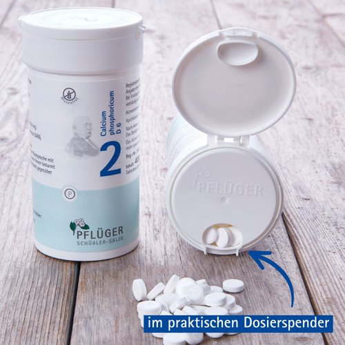 Biochemie Pflüger® Nr. 2 Calcium phosphoricum D6, Zusammensetzung: 1 Tablette enthält: Wirkstoff: Calcium phosphoricum Trit. D6 250 mg. Sonstige Bestandteile: Calciumbehenat (DAB), Kartoffelstärke.