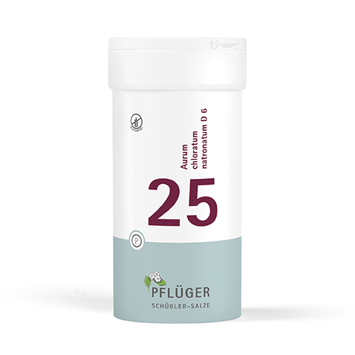 Biochemie Pflüger® Nr. 25 Aurum chloratum natronatum D6, Zusammensetzung: 1 Tablette enthält: Wirkstoff: Aurum chloratum natronatum Trit. D6 250 mg. Sonstige Bestandteile: Calciumbehenat (DAB), Kartoffelstärke. Registriertes homöopathisches Arzneimittel, daher ohne Angabe einer therapeutischen Indikation. Gegenanzeigen/Nebenwirkungen: Keine bekannt. Enthält Lactose. Packungsbeilage beachten. Zu Risiken und Nebenwirkungen lesen Sie die Packungsbeilage und fragen Sie Ihre Ärztin, Ihren Arzt oder in Ihrer Apotheke.