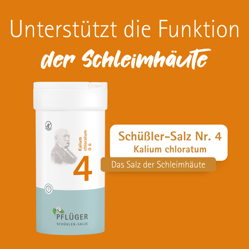 Immer dann, wenn es um unsere Schleimhäute geht empfehlen wir das Schüßler-Salz Nr. 4 Kalium chloratum, das Salz der Schleimhäute.