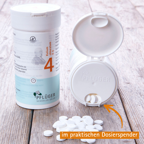 Biochemie Pflüger® Nr. 4 Kalium chloratum D6, Zusammensetzung: 1 Tablette enthält: Wirkstoff: Kalium chloratum Trit. D6 250 mg.
