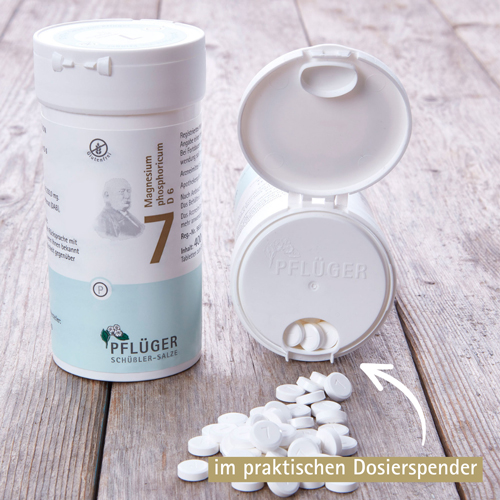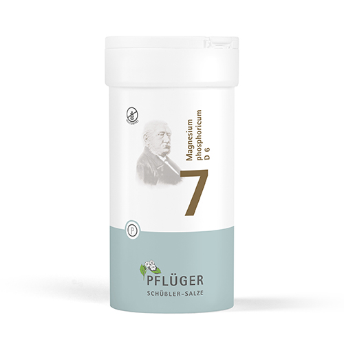 Biochemie Pflüger® Nr. 7 Magnesium phosphoricum D6, Zusammensetzung: 1 Tablette enthält: Wirkstoff: Magnesium phosphoricum Trit. D6 250 mg. Sonstige Bestandteile: Calciumbehenat (DAB), Kartoffelstärke. Registriertes homöopathisches Arzneimittel, daher ohne Angabe einer therapeutischen Indikation. Gegenanzeigen/Nebenwirkungen: keine bekannt. Enthält Lactose. Packungsbeilage beachten. Zu Risiken und Nebenwirkungen lesen Sie die Packungsbeilage und fragen Sie Ihre Ärztin, Ihren Arzt oder in Ihrer Apotheke. Homöopathisches Laboratorium Alexander Pflüger GmbH & Co. KG · 33378 Rheda-Wiedenbrück · info@pflueger.de · www.pflueger.de