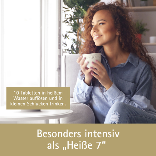 Besonderer Tipp: Als „Heiße 7“ ist es das perfekte Heißgetränk, um Entspannung zu finden und sich wohlzufühlen. Dafür einfach 10 Tabletten in eine Tasse geben und mit 0,2 Liter abgekochtem, heißem Wasser übergießen. Wenn sich die Tabletten aufgelöst haben, wird die „Heiße 7“ langsam in kleinen Schlucken getrunken.
