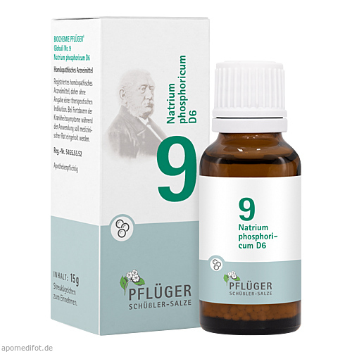 Biochemie Pflüger® Globuli Nr. 9 Natrium phosphoricum D6, Zusammensetzung: In 10 g Streukügelchen sind verarbeitet: Wirkstoff: Natrium phosphoricum Dil. D6 0,1 g. Registriertes homöopathisches Arzneimittel, daher ohne Angabe einer therapeutischen Indikation. Gegenanzeigen/Nebenwirkungen: keine bekannt. Enthält Sucrose. Packungsbeilage beachten. Zu Risiken und Nebenwirkungen lesen Sie die Packungsbeilage und fragen Sie Ihre Ärztin, Ihren Arzt oder in Ihrer Apotheke.
