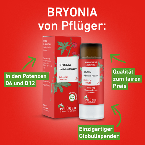 Bryonia D12 Globuli Pflüger®, Zusammensetzung: In 10 g Streukügelchen sind verarbeitet: Wirkstoff: Bryonia Dil. D12 0,1 g. Sonstiger Bestandteil: Saccharose. Registriertes homöopathisches Arzneimittel, daher ohne Angabe einer therapeutischen Indikation. Gegenanzeigen / Nebenwirkungen: Keine bekannt. Enthält Saccharose. Packungsbeilage beachten. Zu Risiken und Nebenwirkungen lesen Sie die Packungsbeilage und fragen Sie Ihre Ärztin, Ihren Arzt oder in Ihrer Apotheke. Homöopathisches Laboratorium Alexander Pflüger GmbH & Co. KG 33378 Rheda-Wiedenbrück info@pflueger.de www.pflueger.de