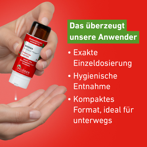 Nur von Pflüger gibt es Bryonia im praktischen Globulispender. Dieser ermöglicht sowohl die hygienische Entnahme als auch eine exakte Dosierung. Unsere Verwender sind von der einfachen Anwendung begeistert und schätzen das kompakte Format auch für die Mitnahme unterwegs.