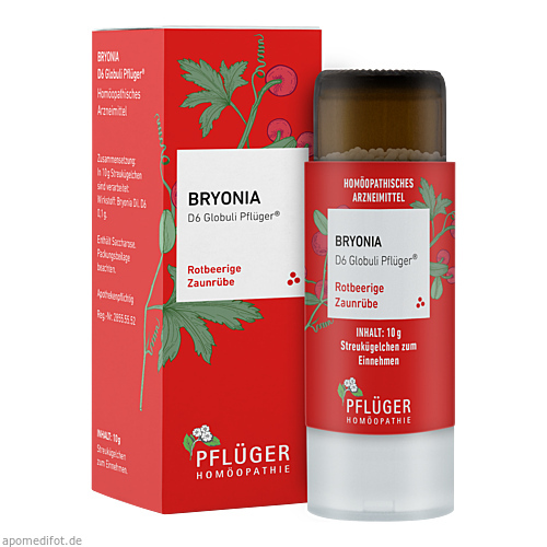 Bryonia D6 Globuli Pflüger®, Zusammensetzung: In 10 g Streukügelchen sind verarbeitet: Wirkstoff: Bryonia Dil. D6 0,1 g. Sonstiger Bestandteil: Saccharose. Registriertes homöopathisches Arzneimittel, daher ohne Angabe einer therapeutischen Indikation. Gegenanzeigen / Nebenwirkungen: Keine bekannt. Enthält Saccharose. Packungsbeilage beachten. Zu Risiken und Nebenwirkungen lesen Sie die Packungsbeilage und fragen Sie Ihre Ärztin, Ihren Arzt oder in Ihrer Apotheke. Homöopathisches Laboratorium Alexander Pflüger GmbH & Co. KG 33378 Rheda-Wiedenbrück info@pflueger.de www.pflueger.de