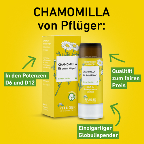 Chamomilla D6 Globuli Pflüger®, Zusammensetzung: In 10 g Streukügelchen sind verarbeitet: Wirkstoff: Chamomilla recutita Dil. D6 0,1 g. Sonstiger Bestandteil: Saccharose. Registriertes homöopathisches Arzneimittel, daher ohne Angabe einer therapeutischen Indikation. Gegenanzeigen / Nebenwirkungen: Keine bekannt. Enthält Saccharose. Packungsbeilage beachten. Zu Risiken und Nebenwirkungen lesen Sie die Packungsbeilage und fragen Sie Ihre Ärztin, Ihren Arzt oder in Ihrer Apotheke. Homöopathisches Laboratorium Alexander Pflüger GmbH & Co. KG 33378 Rheda-Wiedenbrück info@pflueger.de www.pflueger.de