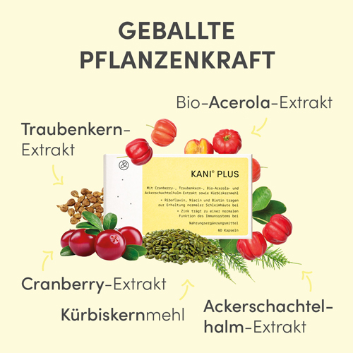 KANI® PLUS ist ein Nahrungsergänzungsmittel zum Erhalt normaler Schleimhaut der Blase** mit der einzigartigen Zusammensetzung aus Cranberry, Kürbiskernmehl, Bio-Ackerschachtelhalm-Extrakt, Traubenkernen, Bio-Acerola, Riboflavin, Niacin und Zink.