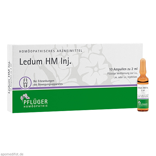 Ledum HM Inj.. Zusammensetzung: 1 Ampulle zu 2 ml enthält: Wirkstoffe: Acidum formicicum Dil. D4 0,15 ml, Berberis vulgaris Dil. D4 0,15 ml, Bryonia Dil. D4 0,15 ml, Ferrum phosphoricum Dil. D8 0,15 ml, Filipendula ulmaria Dil. D6 0,15 ml, Ledum palustre Dil. D3 0,16 ml, Pseudognaphalium obtusifolium e planta tota flor. rec. Dil. D3 (HAB, V. 3a) 0,15 ml, Rhododendron ferrugineum (HAB 34) Dil. D4 [HAB, V. 4a, Urt. mit Ethanol 86 % (m/m)] 0,15 ml, Solanum dulcamara Dil. D6 0,15 ml, Sulfur Dil. D8 0,15 ml. Bestandteile 1-10 über die letzten beiden Stufen gemeinsam potenziert. Sonstige Bestandteile: Natriumchlorid, Wasser für Injektionszwecke. Das Anwendungsgebiet leitet sich von den homöopathischen Arzneimittelbildern ab. Dazu gehört: Besserung rheumatischer Beschwerden. Gegenanzeigen: Kinder unter 2 Jahren, bekannte Allergie gegen Ameisensäure. Nebenwirkungen: Allergische Reaktionen sind möglich. Das Präparat ist dann abzusetzen und ein Arzt aufzusuchen. Zu Risiken und Nebenwirkungen lesen Sie die Packungsbeilage und fragen Sie Ihre Ärztin, Ihren Arzt oder in Ihrer Apotheke. Homöopathisches Laboratorium Alexander Pflüger GmbH & Co. KG 33378 Rheda-Wiedenbrück info@pflueger.de www.pflueger.de