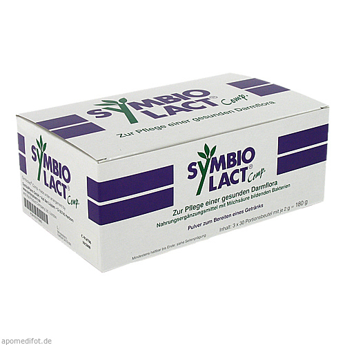 Ein Portionsbeutel SymbioLact®Comp (2 g) entspricht 0,2 BE und enthält 0,005 g Fett (davon < 0,005 g gesättigte Ffettsäuren), 1,9 g Kohlenhydrate (davon 0,3 g Zucker), 0,02 g Eiweiß und 0,003g Salz. Brennwert eines Portionsbeutel (2 g) 32,4 kj/7,6 kcal. Als Vitamine enthält ein Portionsbeutel 30,0 µg Biotin. Das entspricht 60 % der Referenzmenge für die tägliche Zufuhr laut Lebensmittelinformationsverordnung. Ein Portionsbeutel enthält als Milchsäure bildende Bakterien 26,0 mg L. paracasei, 20,0 mg L. acidophilus, 10,0 mg Lc. lactis und 6,0 mg b. lactis. die Gesamtkeimzahl der Milchsäure bildenden Bakterien ≥1 x 109 kbe/g.