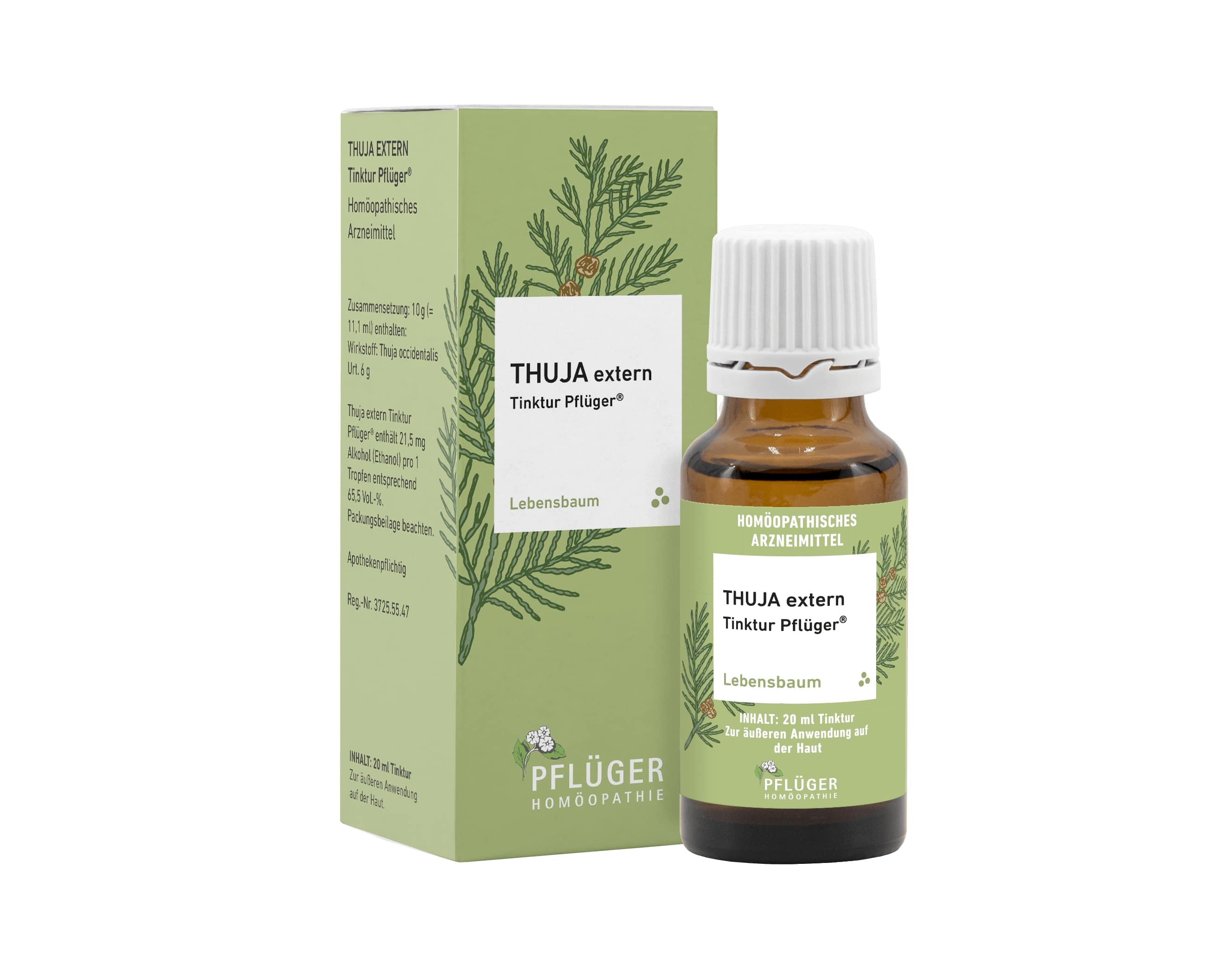 Thuja extern Pflüger®, Zusammensetzung: In 10 g (= 11,1 ml) sind enthalten: Wirkstoff: Thuja occidentalis Urt. 6 g. Sonstiger Bestandteil: Ethanol 62 % (m/m). Registriertes homöopathisches Arzneimittel, daher ohne Angabe einer therapeutischen Indikation. Nicht anwenden in der Schwangerschaft. Nicht anwenden bei bekannter Überempfindlichkeit gegen Thuja (Lebensbaum). Bei Anwendung der unverdünnten Tinktur kann es zu Hautreizungen kommen. Enthält Alkohol. Packungsbeilage beachten. Zu Risiken und Nebenwirkungen lesen Sie die Packungsbeilage und fragen Sie Ihre Ärztin, Ihren Arzt oder in Ihrer Apotheke. Homöopathisches Laboratorium Alexander Pflüger GmbH & Co. KG 33378 Rheda-Wiedenbrück info@pflueger.de www.pflueger.de