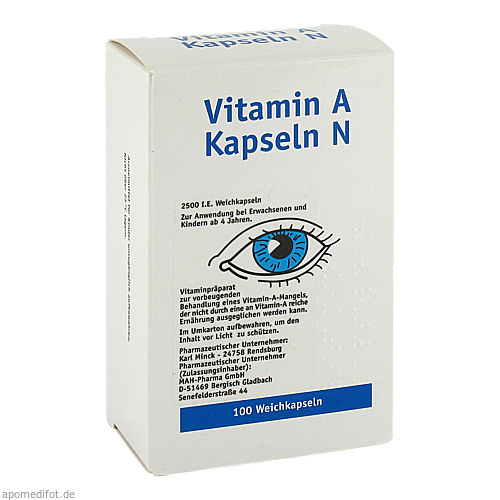 Vitamin A gehört zu den essenziellen Nährstoffen, die wir täglich in ausreichender Menge mit der Nahrung zuführen müssen. Besonders bekannt ist Vitamin A wegen seiner Bedeutung für die Funktion der Augen. Dort trägt es zum normalen Sehen bei. Mit den Kapseln erhalten Sie Vitamin A in Form des hochwertigen, vom Körper gut verwertbaren Retinylpalmitats (auch als Retinolpalmitat bekannt).