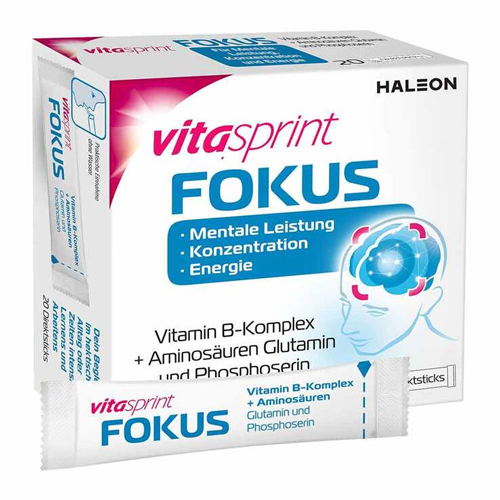 Volle Konzentration! Das neue Vitasprint Fokus ist Ihr Begleiter im Alltag oder Zeiten intensiven Arbeiten und Lernens. Die praktischen Direktsticks versorgen Sie mit einem Nährstoffkomplex aus B-Vitaminen und den Aminosäuren Phosphoserin und Glutamin.