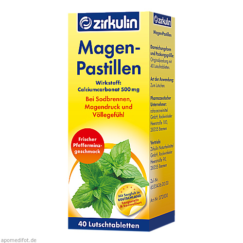 Magen-Pastillen mit dem bewährten säurebindenden Wirkstoff Calciumcarbonat binden und neutralisieren die überschüssige Magensäure. Der Magen beruhigt sich und die Beschwerden klingen ab.